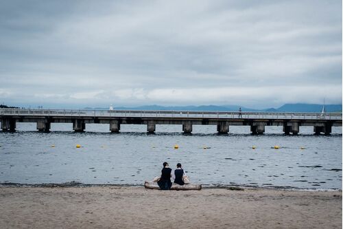 旅の途中、地元の高校生らしき二人が流木に腰掛けている風景に出会った。見知らぬ土地で、いつもと違う空気を吸ってみることの良さをあらためて感じた瞬間だった。 (青森、あおもり駅前ビーチ/α7Ⅲ+SEL55F18Z)