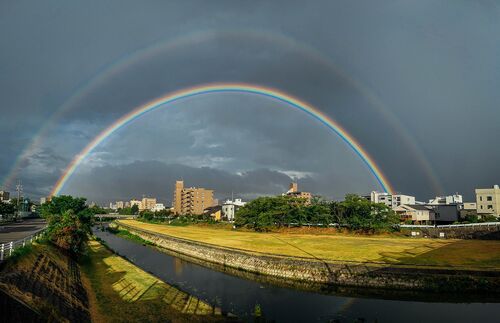 こんな鮮やかな虹を見たことがなかった。仕事帰りに空にかかるこの虹を見つけて、慌てて車を降りてシャッターを切った。 (flickr "Explorer" , August 10, 2023, iPhone 12 Pro Max)